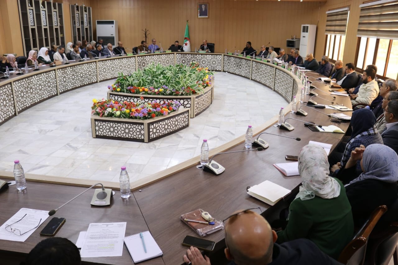 586252593 1283764790445773 7328842135061917535 nشهدت قاعة الاجتماعات بمديرية جامعة بسكرة صباح اليوم الثلاثاء 18 نوفمبر 2025 انعقاد الاجتماع الموسّع لمجلس الجامعة، برئاسة مدير الجامعة الأستاذ الدكتور عبد الحميد جفال، وبحضور الأمين العام، نواب مدير الجامعة، عمداء الكليات، مدير المعهد، مديري الملحقتين، إلى جانب مسؤولي الخلايا والمصالح والمكاتب التقنية والبيداغوجية.