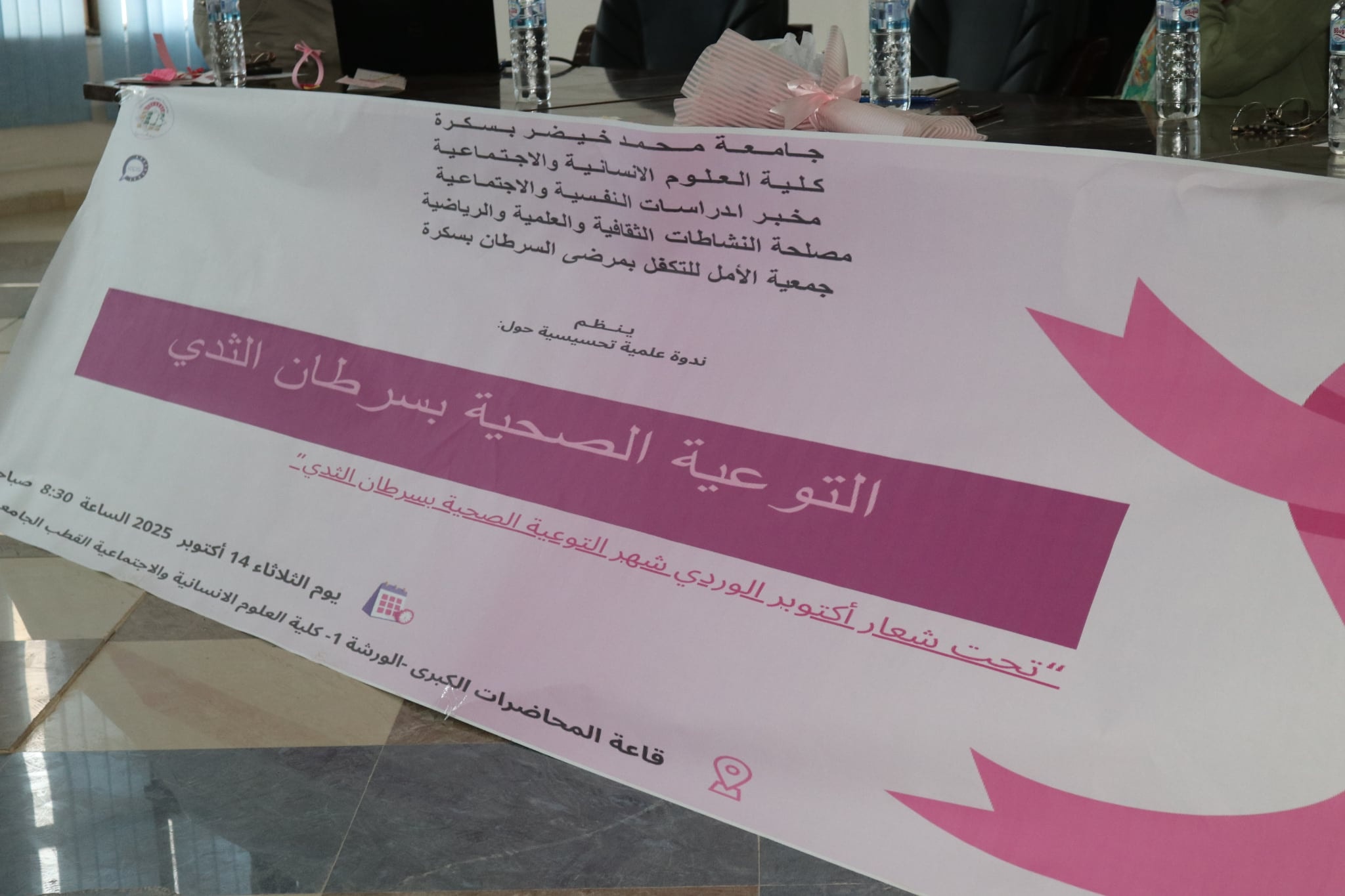 في إطار إحياء شهر أكتوبر الوردي، نظّم مخبر الدراسات النفسية والاجتماعية بكلية العلوم الإنسانية والاجتماعية بجامعة بسكرة، بالتنسيق مع مصلحة نشاطات الكلية وجمعية الأمل لمرضى سرطان الثدي لولاية بسكرة، صبيحة يوم الثلاثاء 14 أكتوبر 2025 بالقطب الجامعي شتمة، ندوة علمية تحسيسية حول التوعية الصحية بسرطان الثدي تحت شعار "أكتوبر الوردي... شهر التوعية الصحية بسرطان الثدي".