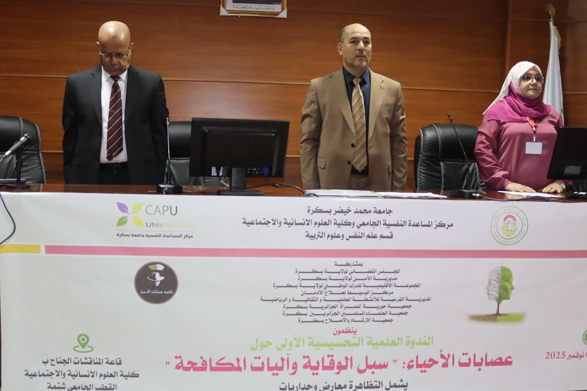 في ظلّ التحديات الاجتماعية والأمنية التي تشهدها المجتمعات المعاصرة، وسعي الجامعة إلى الاضطلاع بدورها في التوعية والتوجيه، نظمت كلية العلوم الإنسانية والاجتماعية بجامعة محمد خيضر بسكرة بالتنسيق مع مركز المساعدة النفسية الجامعي وقسم علم النفس وعلوم التربية، يوم الاثنين 03 نوفمبر 2025، الندوة العلمية التحسيسية الأولى حول عصابات الأحياء: "سبل الوقاية وآليات المكافحة"، بقاعة المناقشات (المدرج ب) بالقطب الجامعي شتمة.