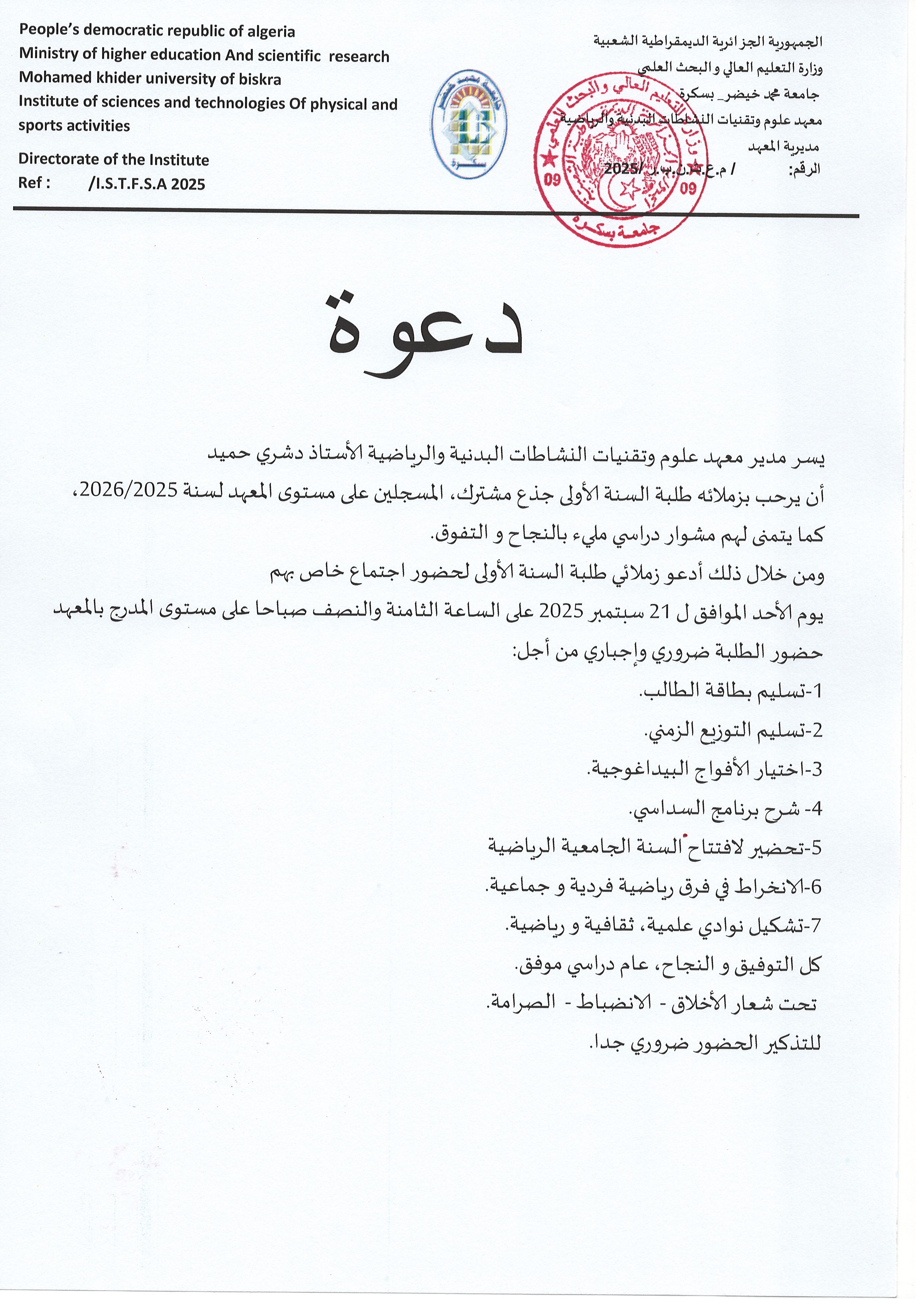 يسر مدير معهد علوم وتقنيات النشاطات البدنية و الرياضية الأستاذ: دشري حميد بدعوة طلبة الأولى ليسانس للسنة الجامعية 2025 / 2026 الى مقر المعهد بجامعة محمد خيضر بسكرة و ذلك يوم الاحد 21 سبتمبر 2025 على الساعة الثامنة و النصف صباحا تحميل الدعوة