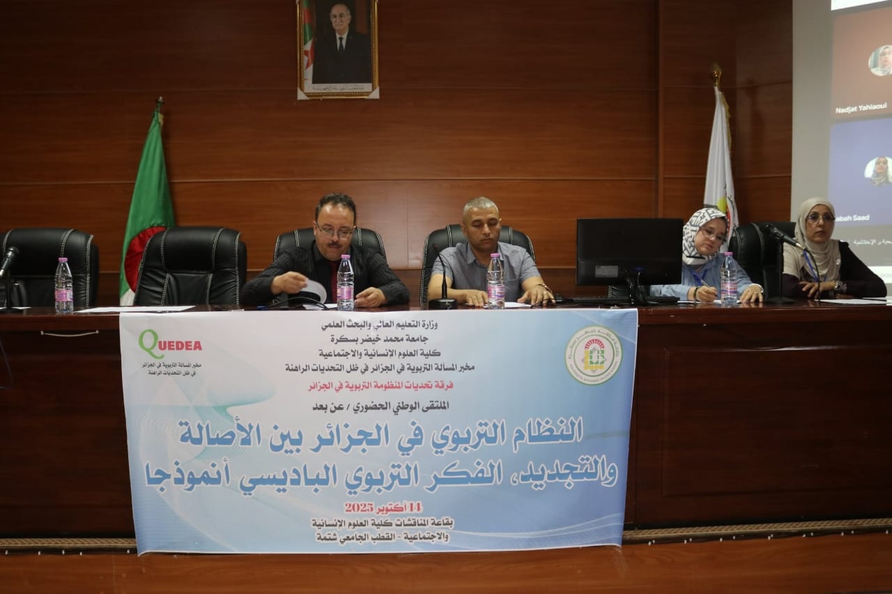 في إطار الاهتمام المتواصل بالقضايا التربوية الراهنة، نظّمت كلية العلوم الإنسانية والاجتماعية بجامعة بسكرة، من خلال مخبر المسألة التربوية في الجزائر في ظل التحديات الراهنة، صبيحة يوم الثلاثاء 14 أكتوبر 2025، أشغال الملتقى الوطني الموسوم بـ "النظام التربوي في الجزائر بين الأصالة والتجديد: الفكر التربوي الباديسي أنموذجًا".