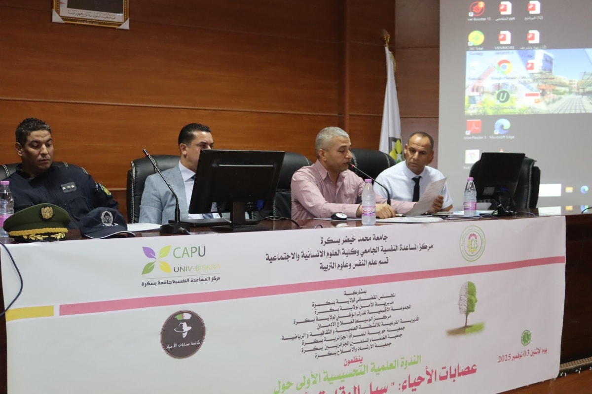 في ظلّ التحديات الاجتماعية والأمنية التي تشهدها المجتمعات المعاصرة، وسعي الجامعة إلى الاضطلاع بدورها في التوعية والتوجيه، نظمت كلية العلوم الإنسانية والاجتماعية بجامعة محمد خيضر بسكرة بالتنسيق مع مركز المساعدة النفسية الجامعي وقسم علم النفس وعلوم التربية، يوم الاثنين 03 نوفمبر 2025، الندوة العلمية التحسيسية الأولى حول عصابات الأحياء: "سبل الوقاية وآليات المكافحة"، بقاعة المناقشات (المدرج ب) بالقطب الجامعي شتمة.