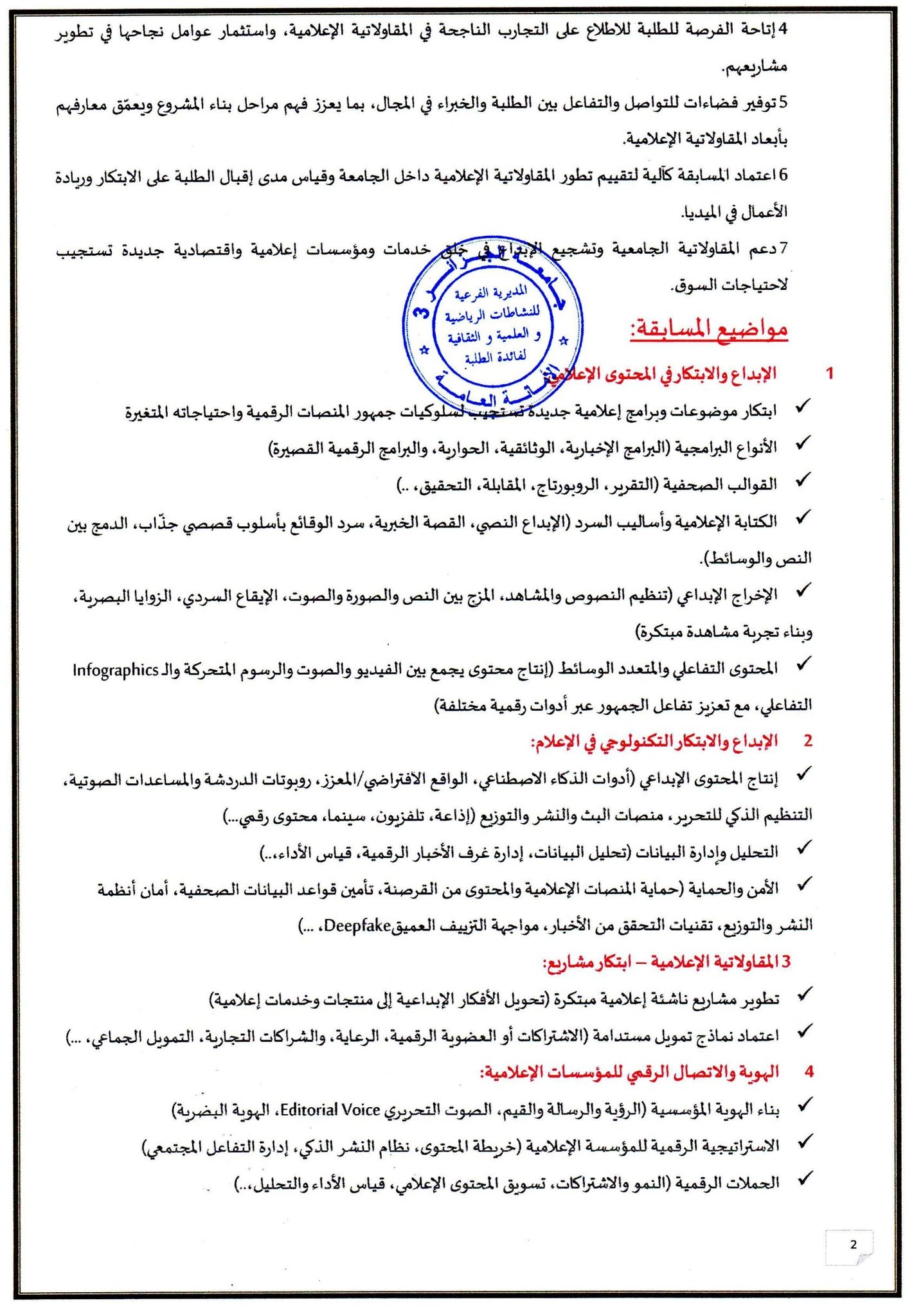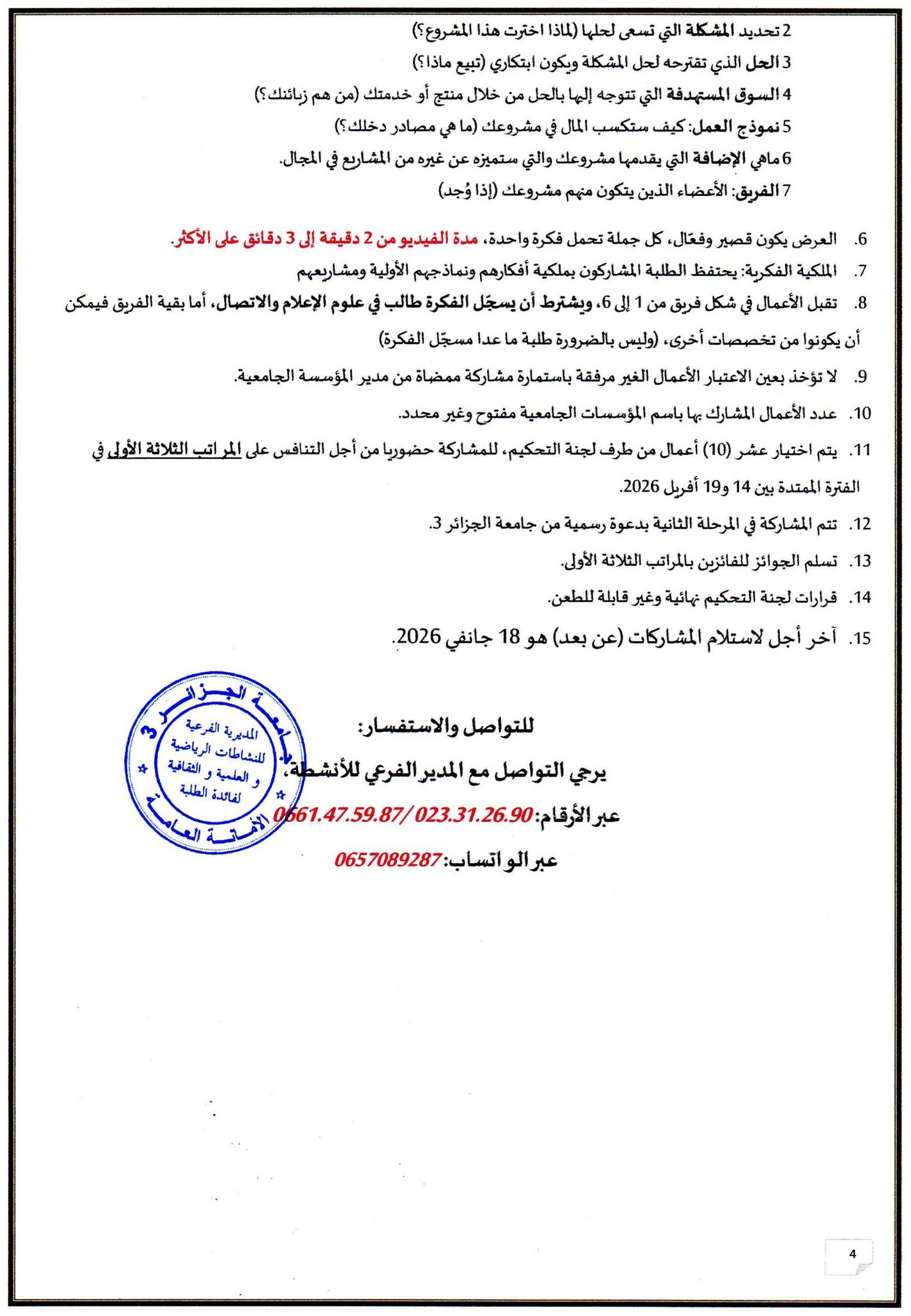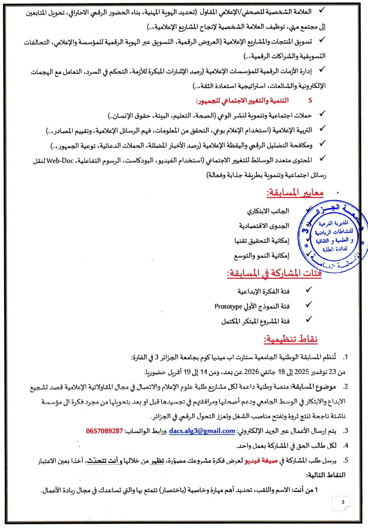 تجسيدا للبرنامج السنوي (2025-2026)، المتعلق بالأنشطة العلمية الثقافية والرياضية، الذي سطرته مديرية الحياة الطلابية بالتنسيق مع الديوان الوطني للخدمات الجامعية، يشرفني إعلامكم بتنظيم المسابقةالوطنية الجامعية للمقاولاتية الإعلامية   START UP MEDIA COM التي ستنظمها جامعة   براهيم سلطان شيبوط الجزائر03،والتي تجرى على مرحلتين