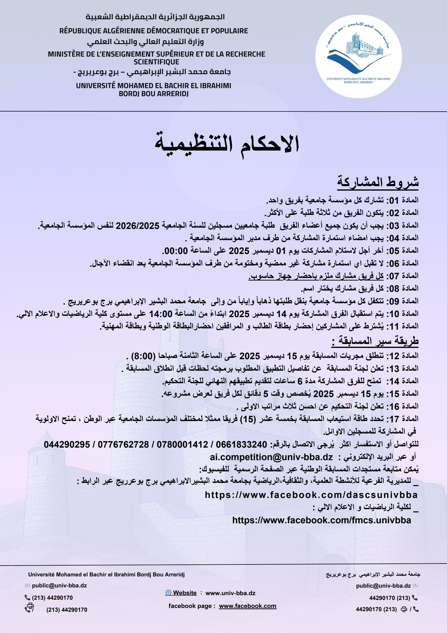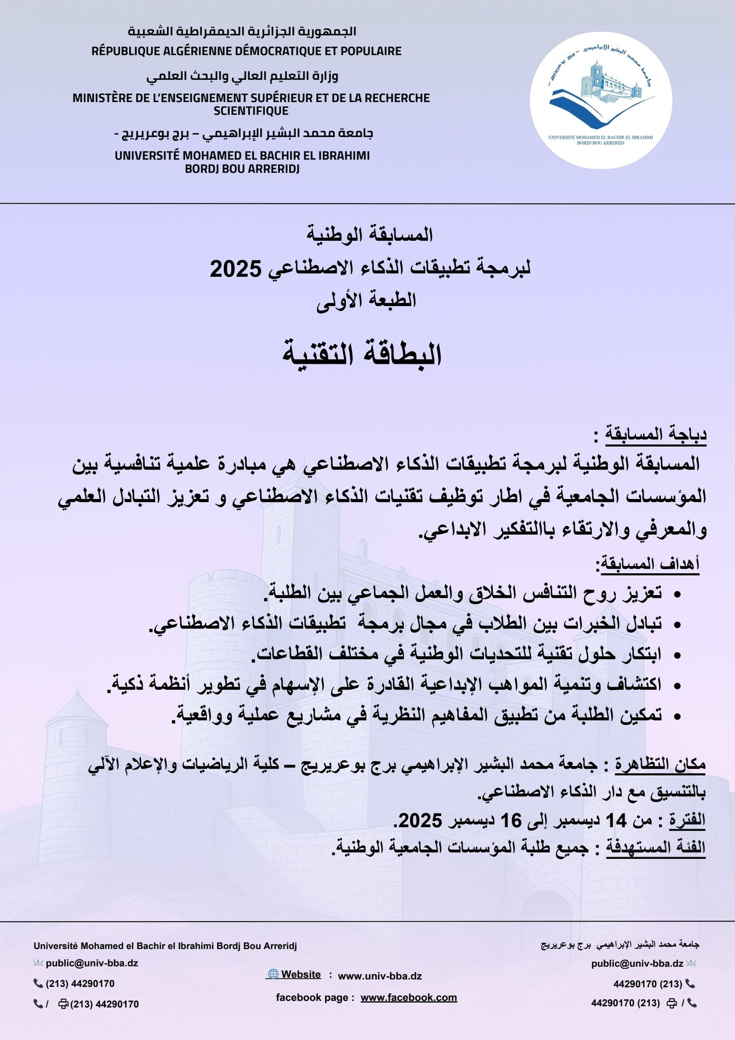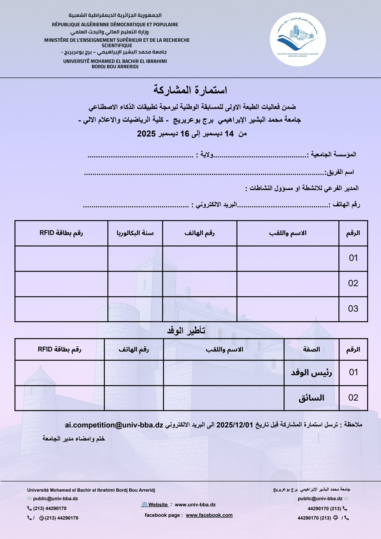وعليه الرجاء النشر الواسع ليتسنى لجميع الطلبة المشاركة في هذا النشاط العلمي الهام، على أن ترسل استمارات المشاركة وفقا للمطلوب في البطاقة التقنية.
