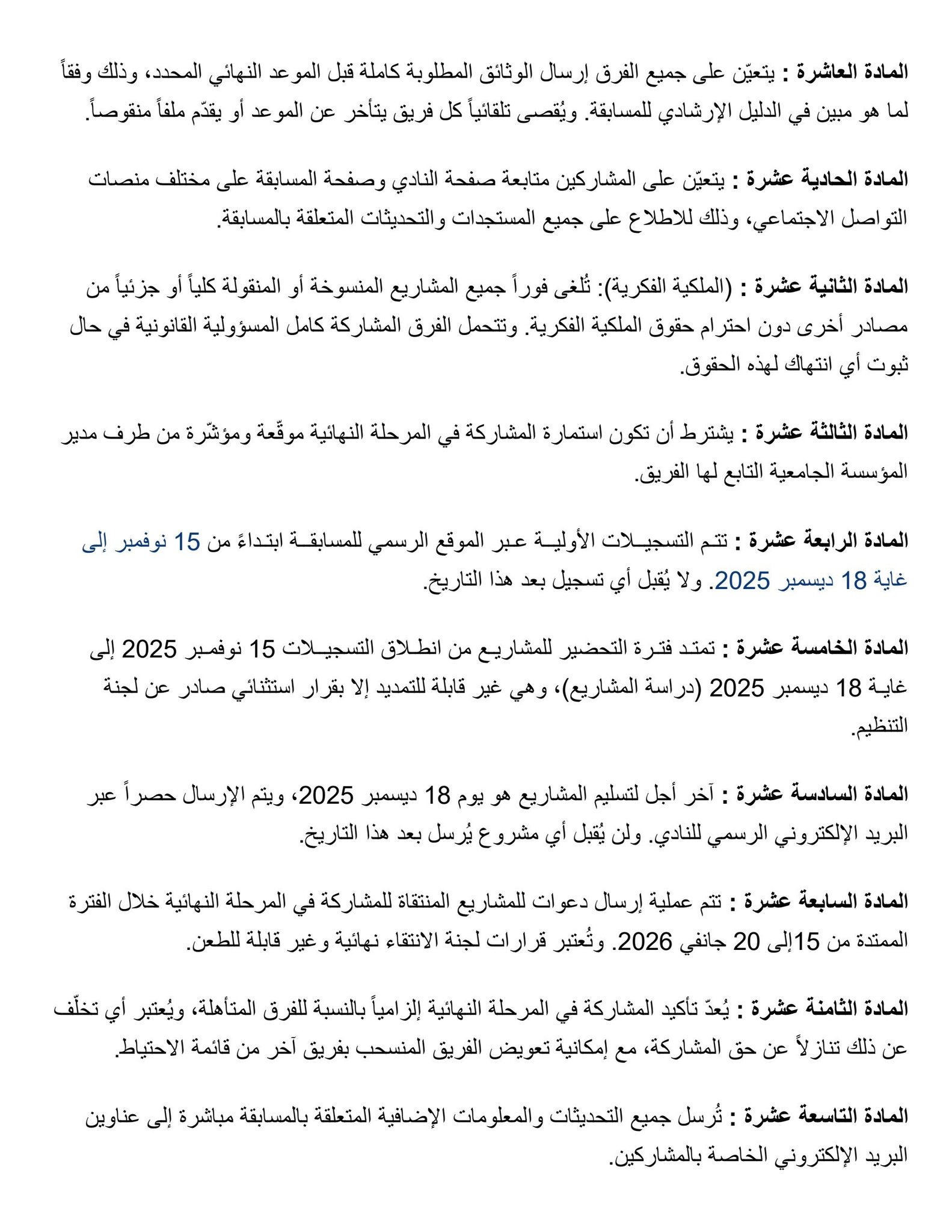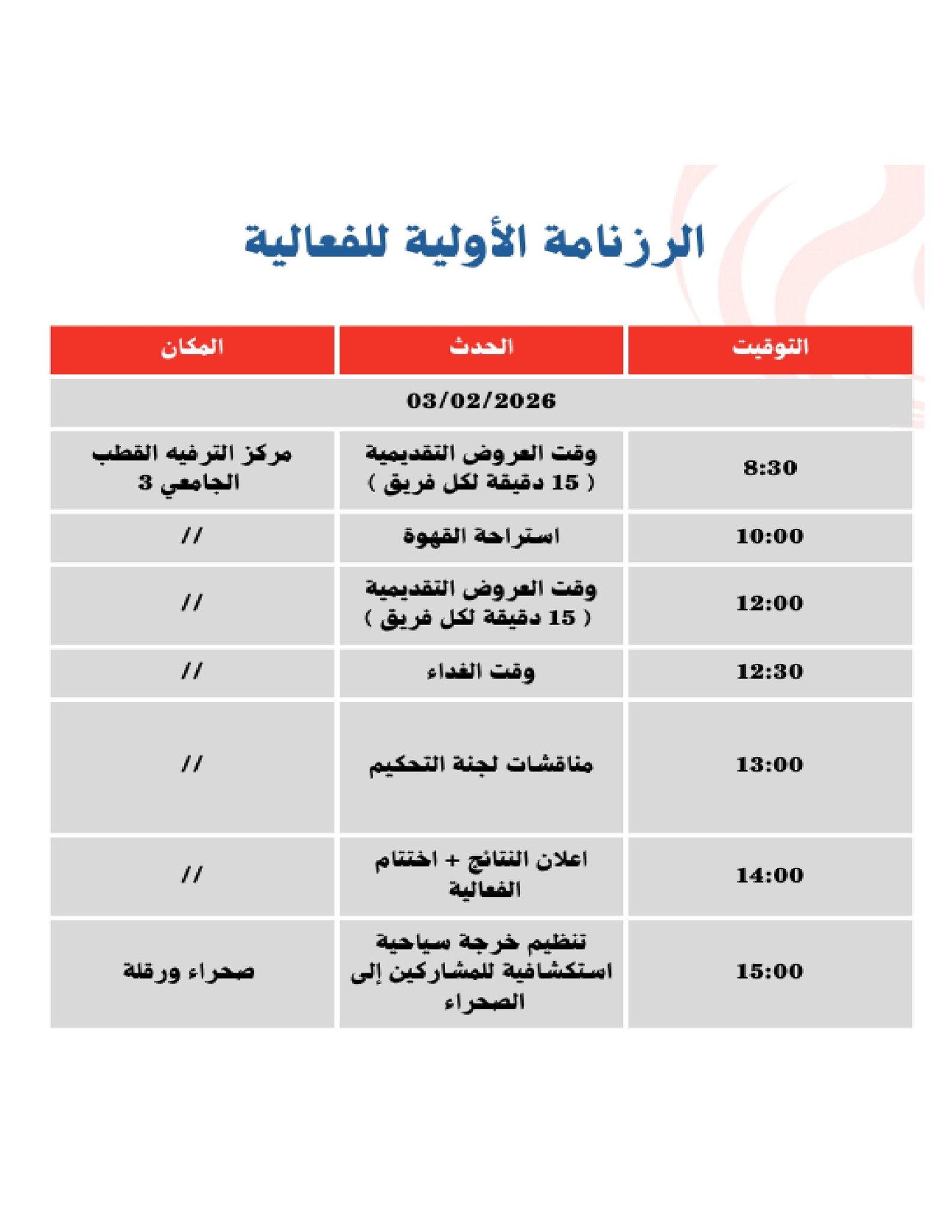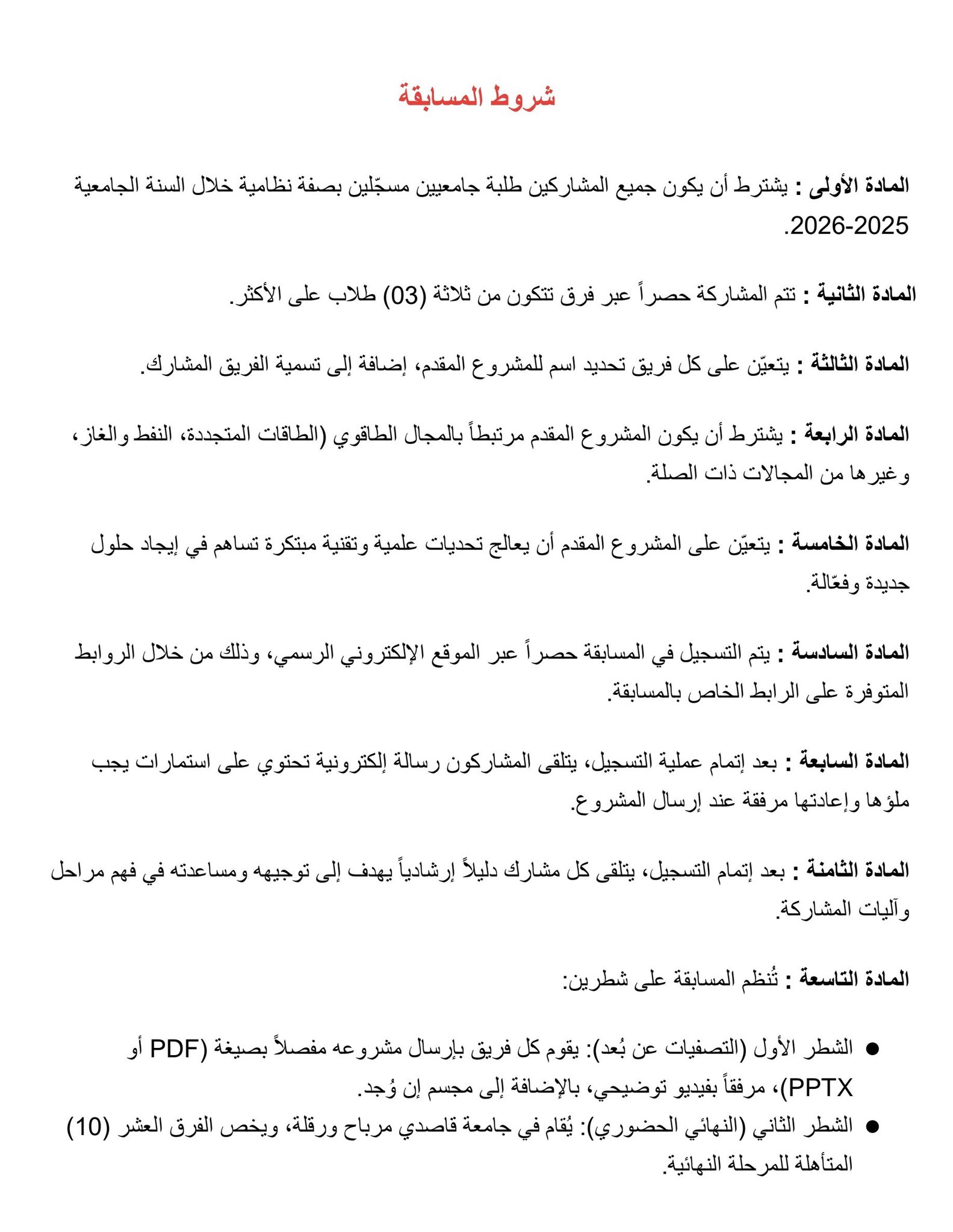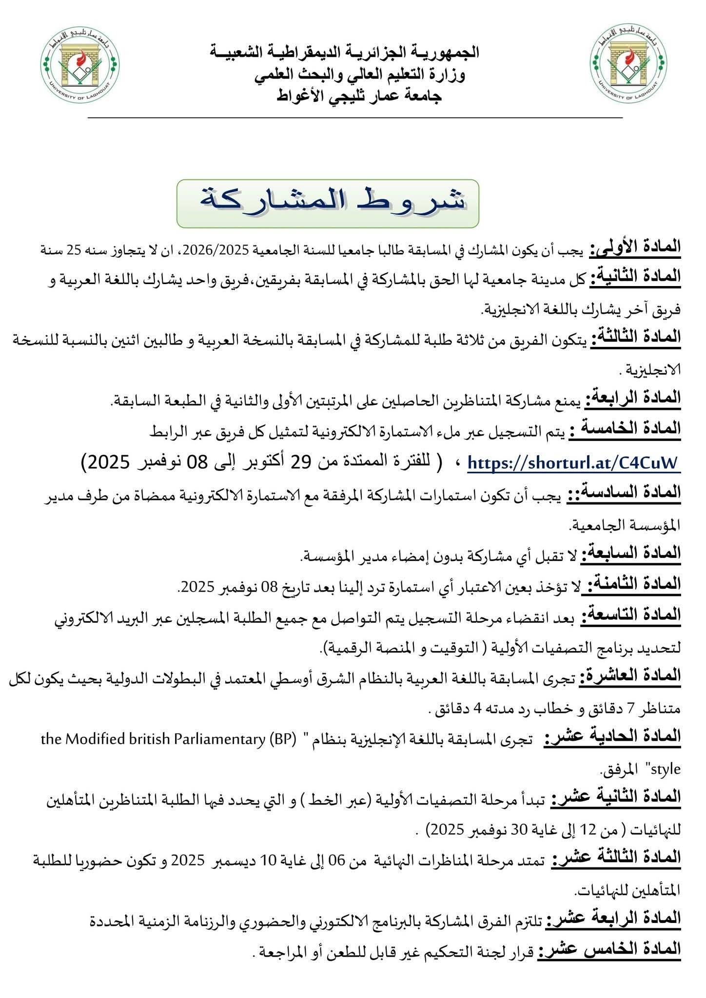 وعليه الرجاء النشر الواسع ليتسنى لجميع الطلبة المشاركة في هذا النشاط العلمي الهام، على أن ترسل استمارات المشاركة وفقا للمطلوب في البطاقة التقنية.