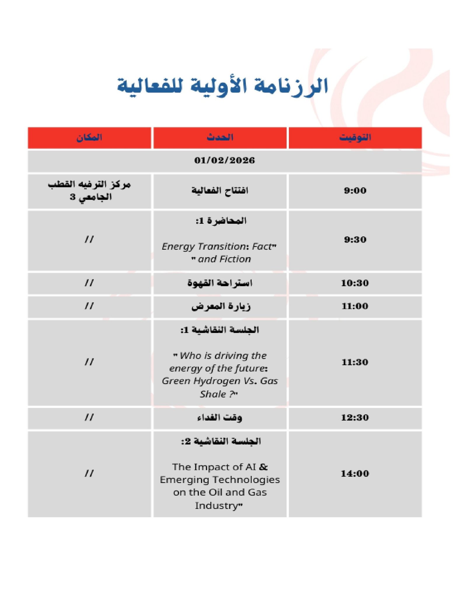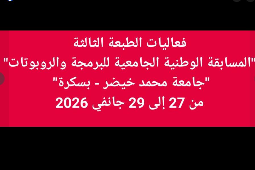 تجسيدا للبرنامج السنوي (2025-2026)، المتعلق بالأنشطة العلمية والثقافية والرياضية، الذي سطرته مديرية الحياة الطلابية بالتنسيق مع الديوان الوطني للخدمات الجامعية، يشرفني إعلامكم بتنظيم المسابقة الوطنية الجامعية في الأمن الطاقوي IGENTTE REVOLUTIONISING THE ENERGY SECTOR ، ALGERIA 2026 والتي تنظمها المديرية الفرعية للأنشطة العلمية الثقافية والرياضية بالتنسيق مع نادي الإبداع من أجل التغييرCF تحت إشراف جامعة قاصدي مرباح ورقلة، وذلك في الفترة الممتدة من01 إلى 03 فيفري 2026، بمركز الترفيه القطب الجامعي 03.