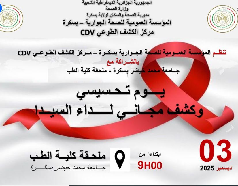 في إطار تعزيز الوعي الصحي وترسيخ ثقافة الوقاية داخل الوسط الجامعي، تنظم ملحقة كلية الطب بجامعة محمد خيضر بسكرة وبالتعاون مع المؤسسة العمومية للصحة الجوارية يومًا توعويًا تحسيسيًا حول السيدا (فيروس نقص المناعة البشري)، بمشاركة طاقم طبي