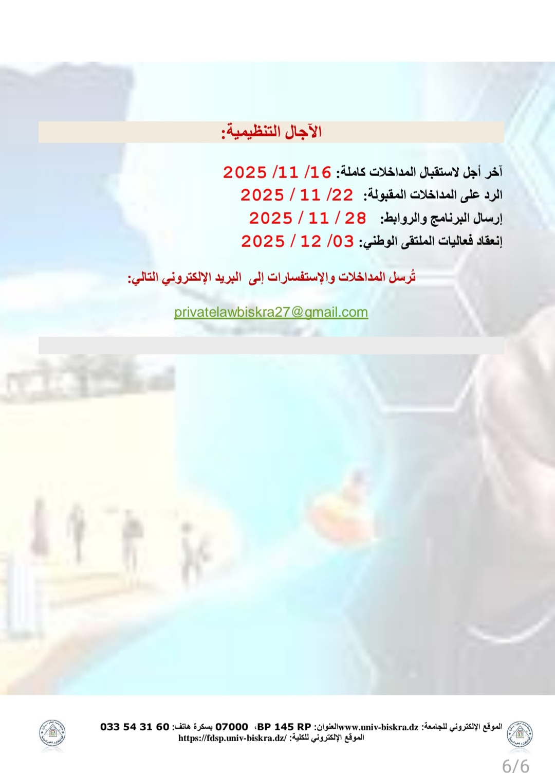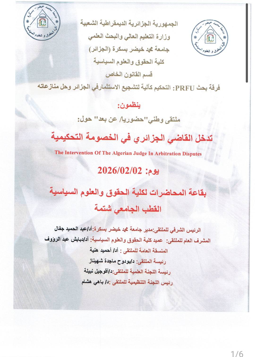 يطيب لهيئة الملتقى الوطني الموسوم بـــ: "اَلية الدفع بعدم الدستورية  في الجزائر" المزمع إنعقاده يوم: الأربعاء 04 ديسمبر 2024؛ أن تدعو سيادتكم الكريمة للحضور والمشاركة في فعاليات الملتقى الوطني المذكور أعلاه؛ الذي سيكون حضوريا في رحاب كلية الحقوق والعلوم السياسية جامعة محمد خيضر بسكرة (القطب الجامعي شتمة)؛ فضلا عن برمجة جلسات إفتراضية عبر تقنية التحاضر عن بعد