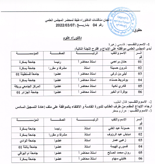 لجان المناقشات طبقا لمحضــر اجتماع المجـلس العلمي رقم 06 -بتاريخ 29/06/2020       الحقوق: