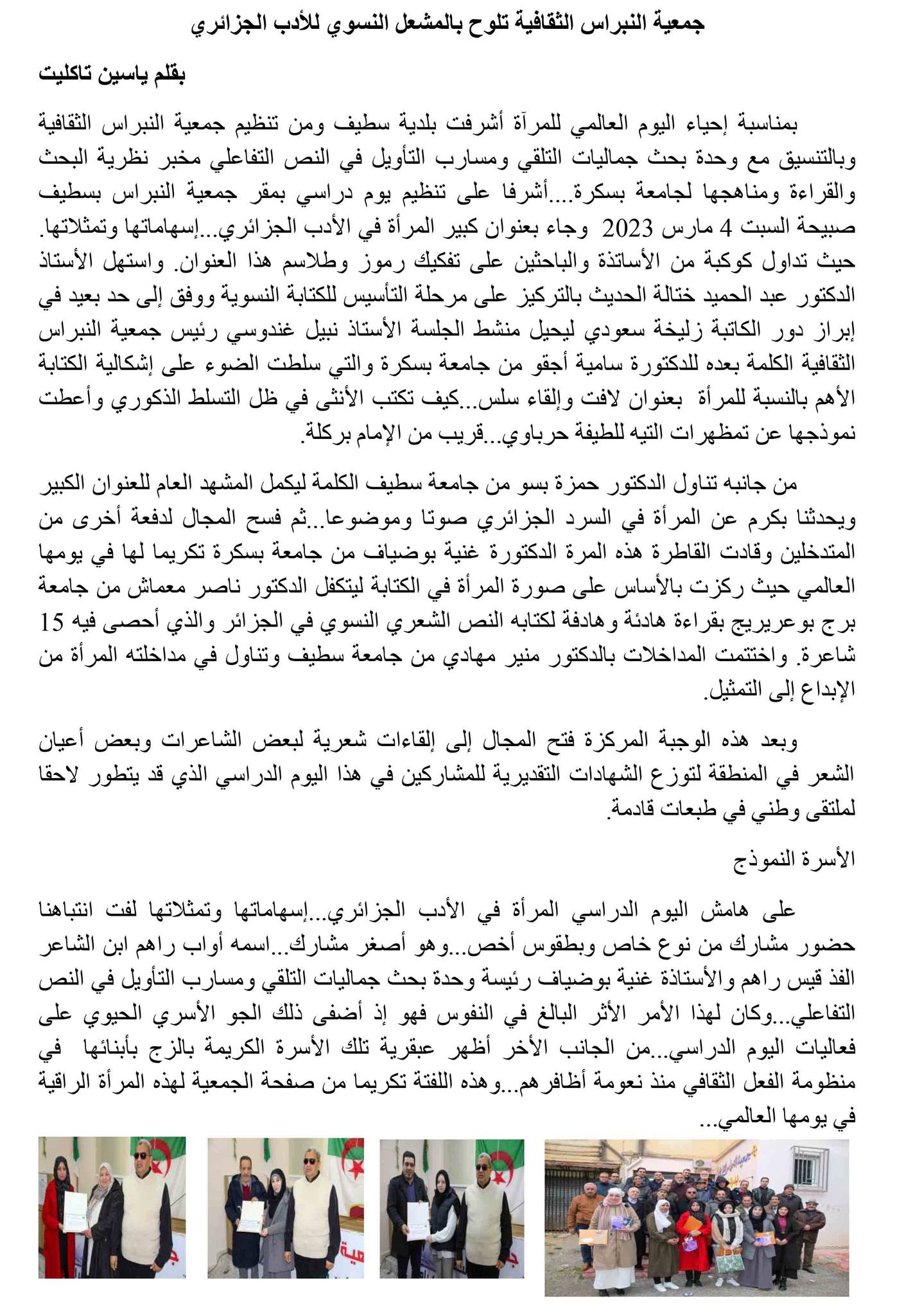 نظمت وحدة البحث prfu ( جماليات التلقي و مسارب التأويل في النص التفاعلي ) التابعة لمخبر وحدة البحث في نظرية القراءة و مناهجها بجامعة بسكر بالشراكة مع جمعية النبراس الثقافي بسطيف يوما دراسيا لإحياء اليوم العالمي للمرأة بعنوان ( المرأة في الأدب الجزائري ، إسهاماتها و تمثلاتها ) ، يوم 4 مارس 2023 . و قد حضر و حاضر بهذا اليوم الدراسي ثلة من الأساتذة الجامعيين : جامعة سطيف - جامعة برج بوعريريج - جامعة خنشلة - جامعة بسكرة . كما تخلل هذه المحاضرات قراءات شعرية و مناقشات ثرية