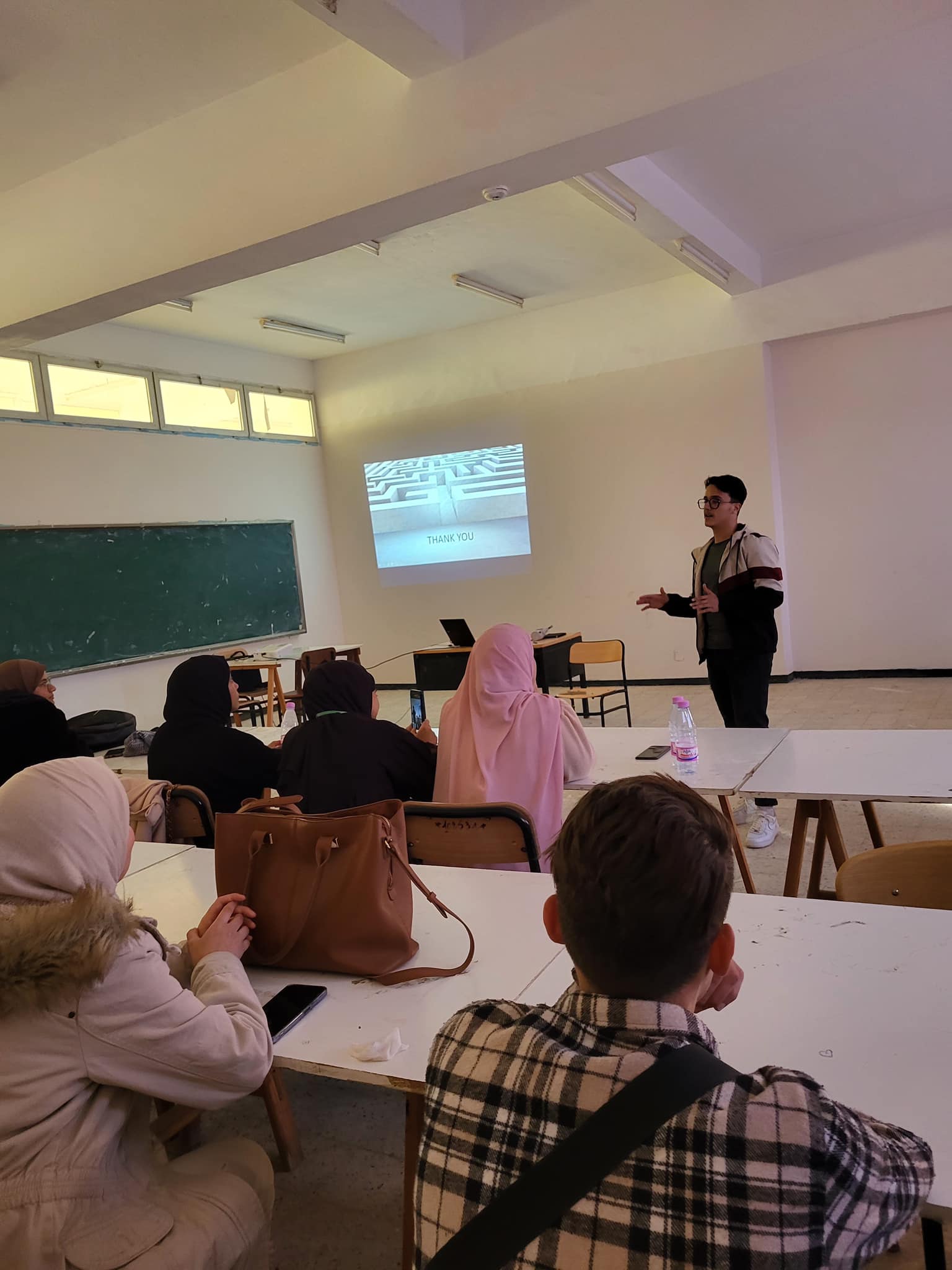 تمت يوم 12/12/2023 علي الساعة 13:30 بالورشة رقم (02) دورة فن الالقاء حيث كان النشاط بحضور كل من رئيس القسم الأستاذ هيمة عمارة والاستاذة المشرفة علي النادي قسماالله نجاة ورئيس مصلحة النشاطات لكلية العلوم الدقيقة وعلوم الطبيعة والحياة وحضور طلبة من قسم علوم الارض والكون مختلف السنوات وطلبة من اقسام مختلفة رياضيات وعلوم زراعية...