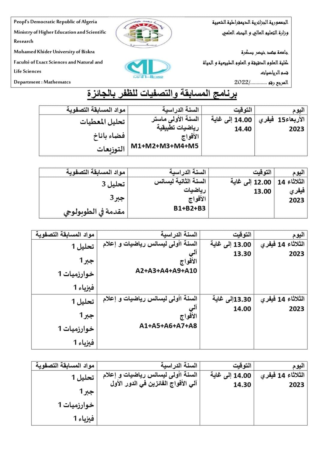 نظم نادي جزيرة الرياضيات MATHLAND لقسم الرياضيات بالتنسيق مع مصلحة النشاطات العلمية والثقافية والرياضية لكلية العلوم الدقيقة وعلوم الطبيعة والحياة جامعة بسكرة، صبيحة يوم الإثنين 16 أكتوبر 2023 أبواب مفتوحة على النادي تحت شعار "لنجعل الرياضيات أكثر مرحاً وقرباً من الواقع".حضر هذا النشاط العلمي السيد عميد كلية العلوم الدقيقة وعلوم الطبيعة والحياة الأستاذ عبد عطاف معية رئيس قسم الرياضيات الأستاذ عماد الدين لخذاري الأخير رحب بالحضور وقدم شروحات حول القسم وكيفية التسجيل فيه، كما أثنى السيد العميد بمثل هكذا نشاطات طلابية وخاصة في المجال العلمي أين أولى له الأهمية الكبرى من حيث التنشيط في الوسط الجامعي.