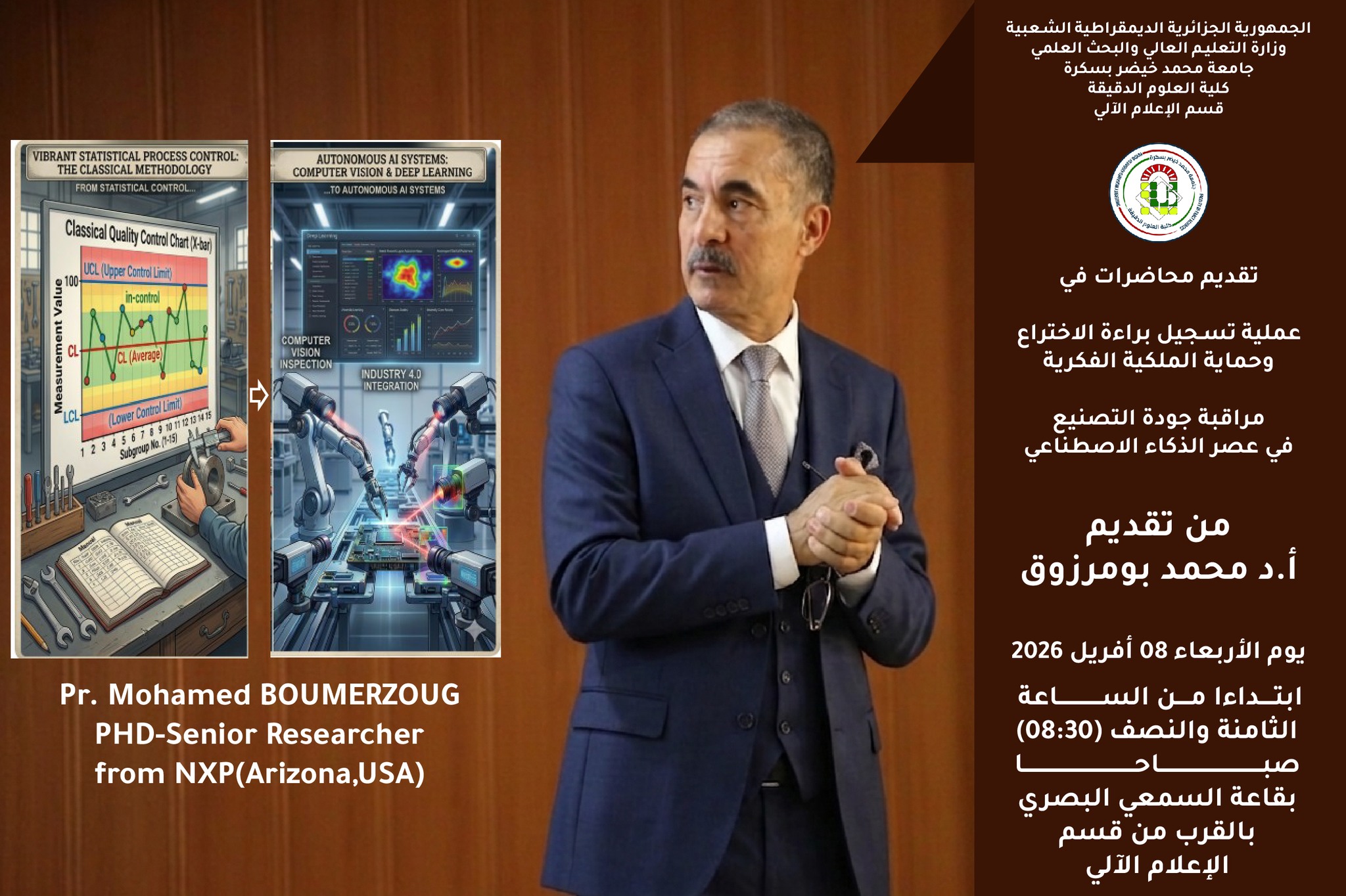يتشرف قسم الإعلام الالي بدعوتكم لحضور فعاليات المحاضرات العلمية من تقديم الدكتور محمد بومرزوق أحد علماء البيانات الذي يشغل منصب رئيسي في شركة NXP العالمية، وذلك يوم الأربعاء 08 أفريل 2026 بقاعة السمعي البصري بالقرب من قسم الإعلام الآلي ابتداءا من الساعة الثامنة والنصف (08:30) صباحا