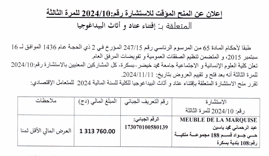 إعــلان عن المنح المؤقت للاستشارة رقم: 2024/10 للمرة الثالثة