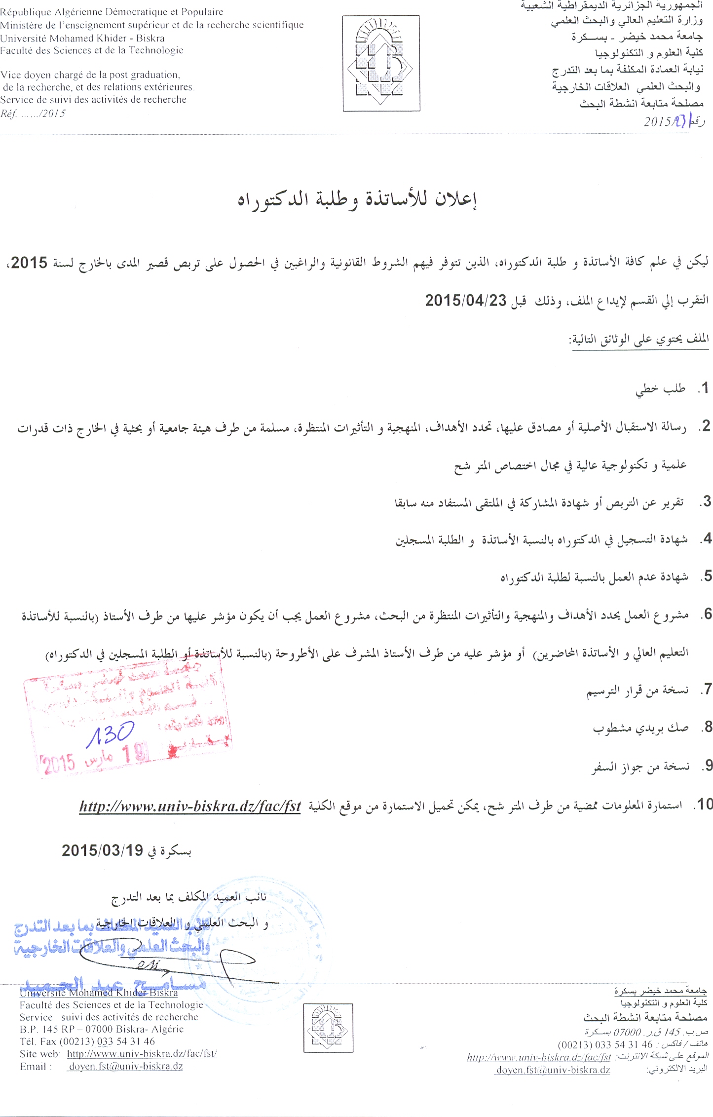 إعلان للأساتذة وطلبة الدكتوراه ليكن في علم كافة الأساتذة وطلبة الدكتوراه الذين تتوفر فيهم الشروط القانونية و الراغبين في الحصول على تربص قصير المدى بالخارج لسنة 2015، أنه يمكنهم إيداع ملفاتهم على مستوى الأقسام وذلك قبل 2015/04/23 الملف يحتوي على الوثائق التالية: استمارة المعلومات Prev Next