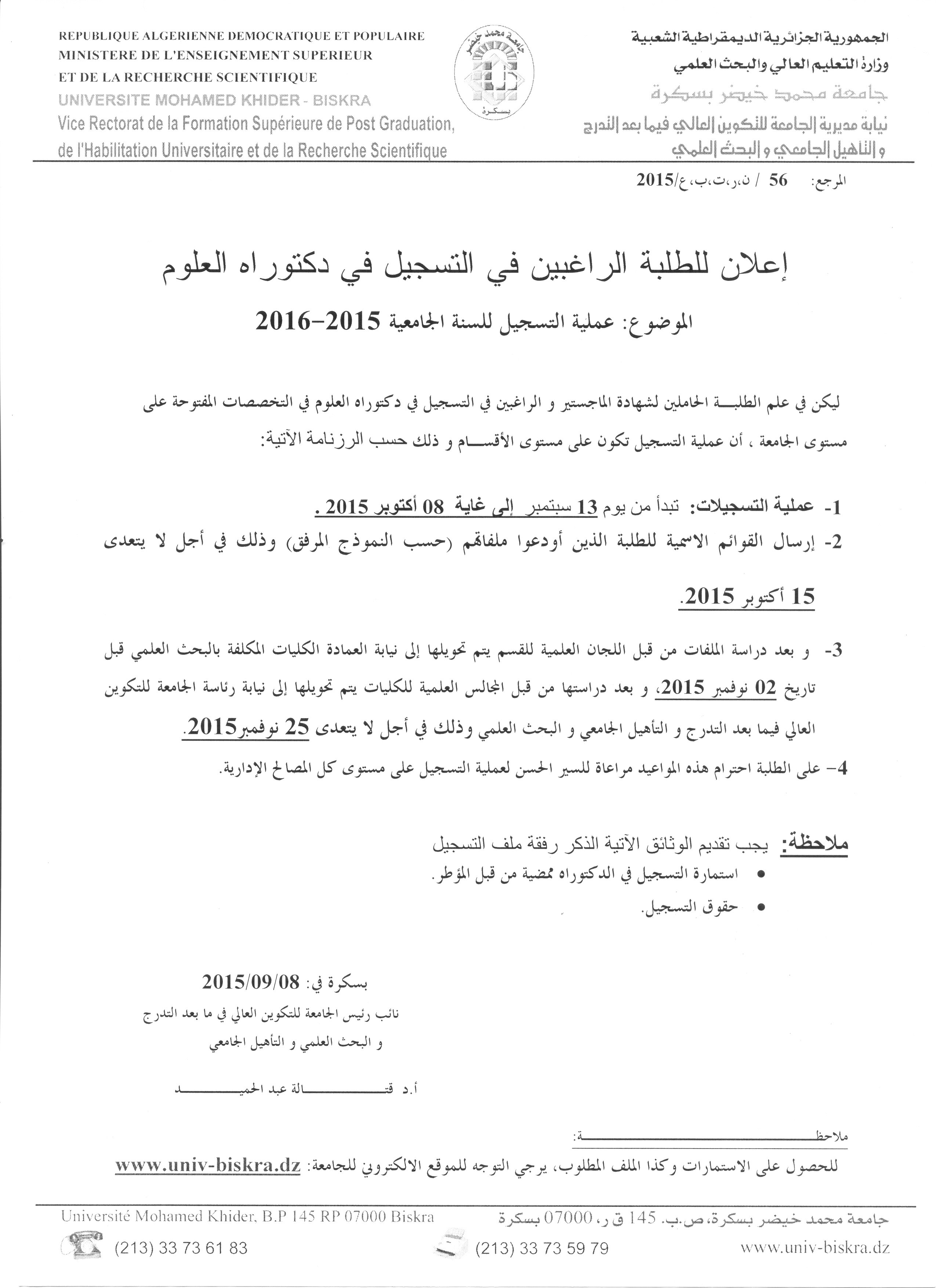 عملية التسجيل للسنة الجامعية 2015-2016