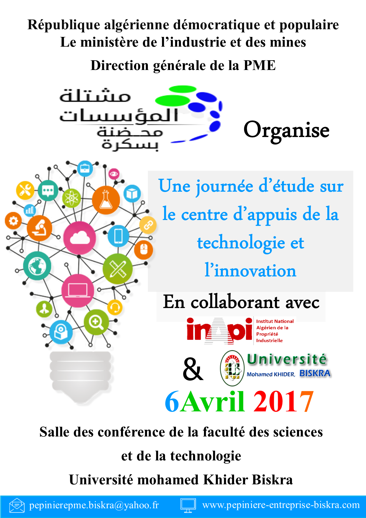 في اطار مد جسور التواصل بين عالم الاعمال و عالم البحث العلمي و في اطار تقديم خدمات المرافقة و الدعم لحاملي المشاريع خاصة فيما يتعلق بنشر ثقافة تسجيل العلامات التجارية و الابتكارات و برعاية السيد والي ولاية بسكرة, تنظم كلية العلوم و التكنولوجيا و مشتلة المؤسسات "محضنة بسكرة" يوم دراسي حول " مركز دعم التكنولوجيا و الابتكار CATI " بالتعاون مع المعهد الوطني الجزائري للملكية الصناعية, مديرية الصناعة و المناجم و ذلك يوم 06 أفريل 2017 على الساعة 09:00 صباحا بقاعة المحاضرات بالكلية .