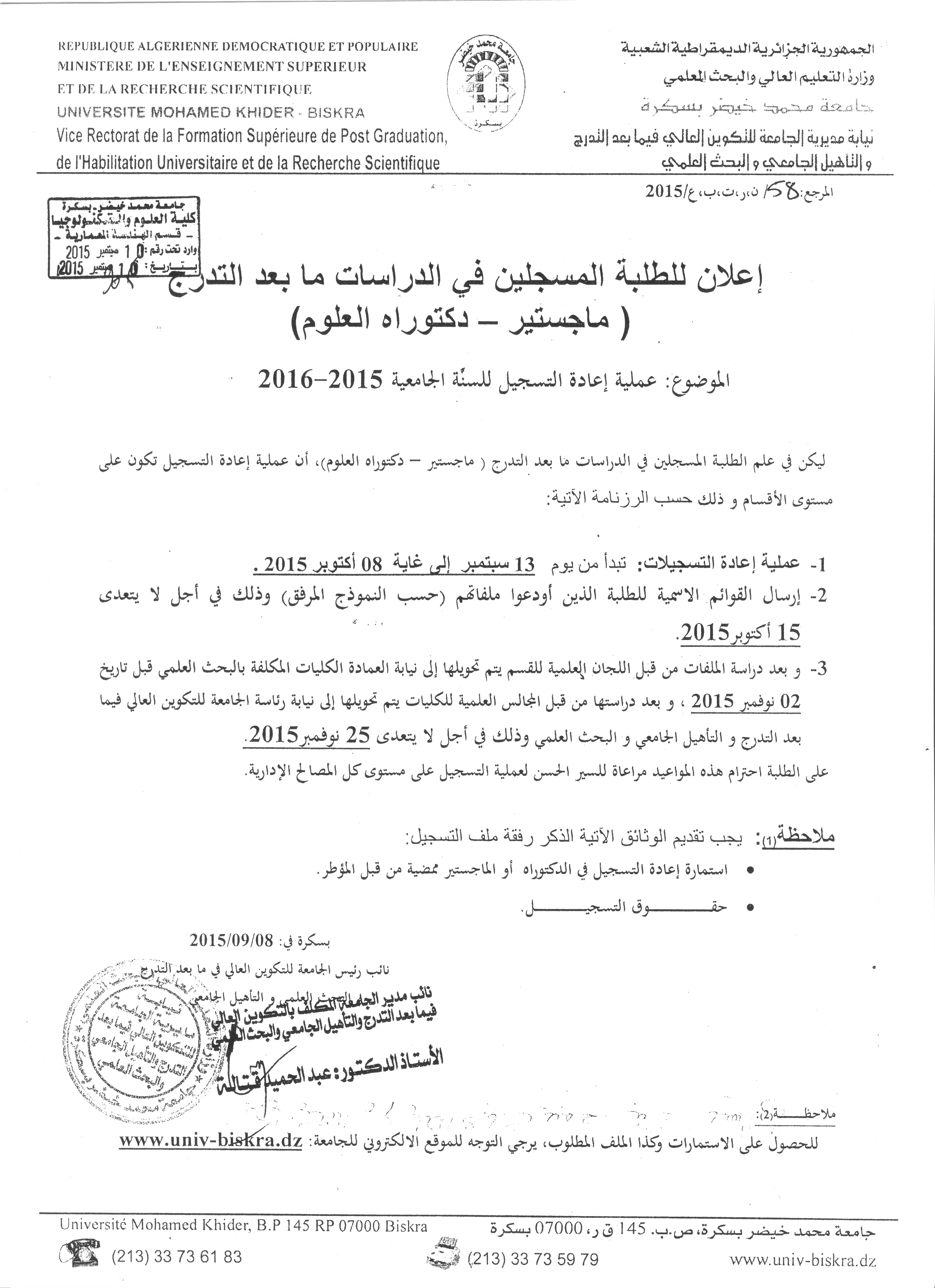 Unpublishedليكن في علم جميع أساتذة قسم الهندسة الميكانيكية و كذا المؤطرين من خارج القسم، أن اجتماع بيداغوجي للقسم قد برمج يوم الثلاثاء 2015/09/29 على الساعة 15:00 زوالا بقاعة الاجتماعات بالكلية (قاعة مناقشة مذكرات الماجستير سابقا)، و ذلك لمناقشة النقاط التالية (الحضور اجباري):