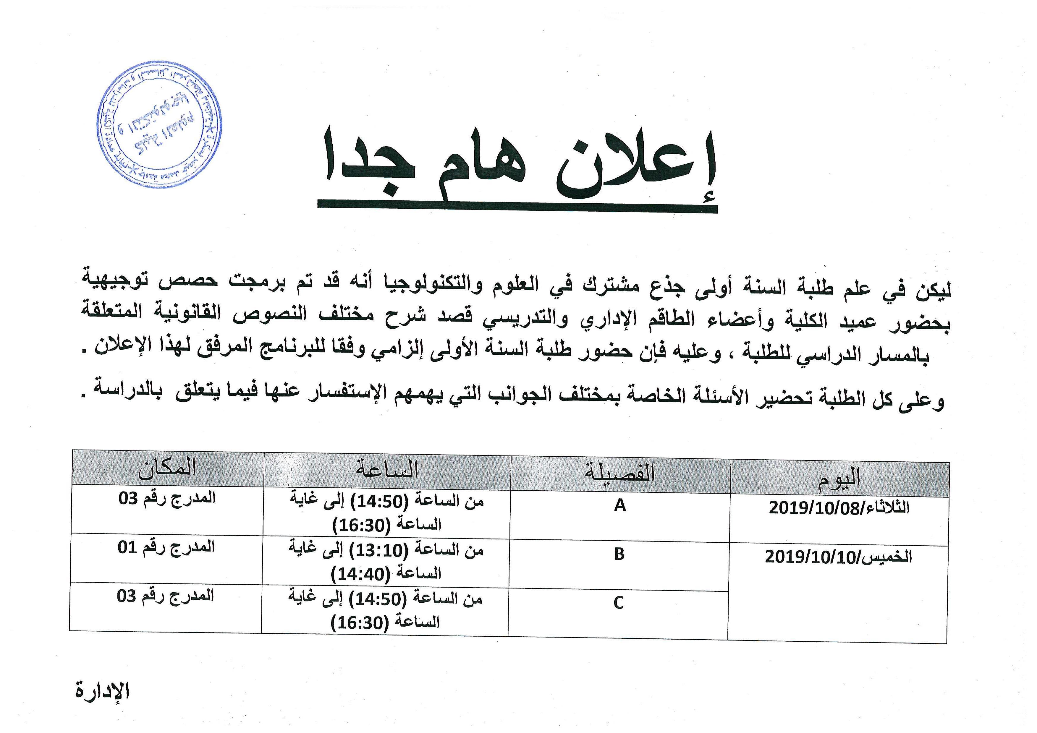 ليكن في علم طلبة السنة أولى جذع مشترك في العلوم والتكنولوجيا أنه قد تم برمجة حصص توجيهية بحضور عميد الكلية وأعضاء الطاقم الإداري والتدريسي قصد شرح مختلف النصوص القانونية المتعلقة بالمسار الدراسي للطلبة ، وعليه فإن حضور طلبة السنة الأولى إلزامي وفقا للبرنامج المرفق لهذا الإعلان.