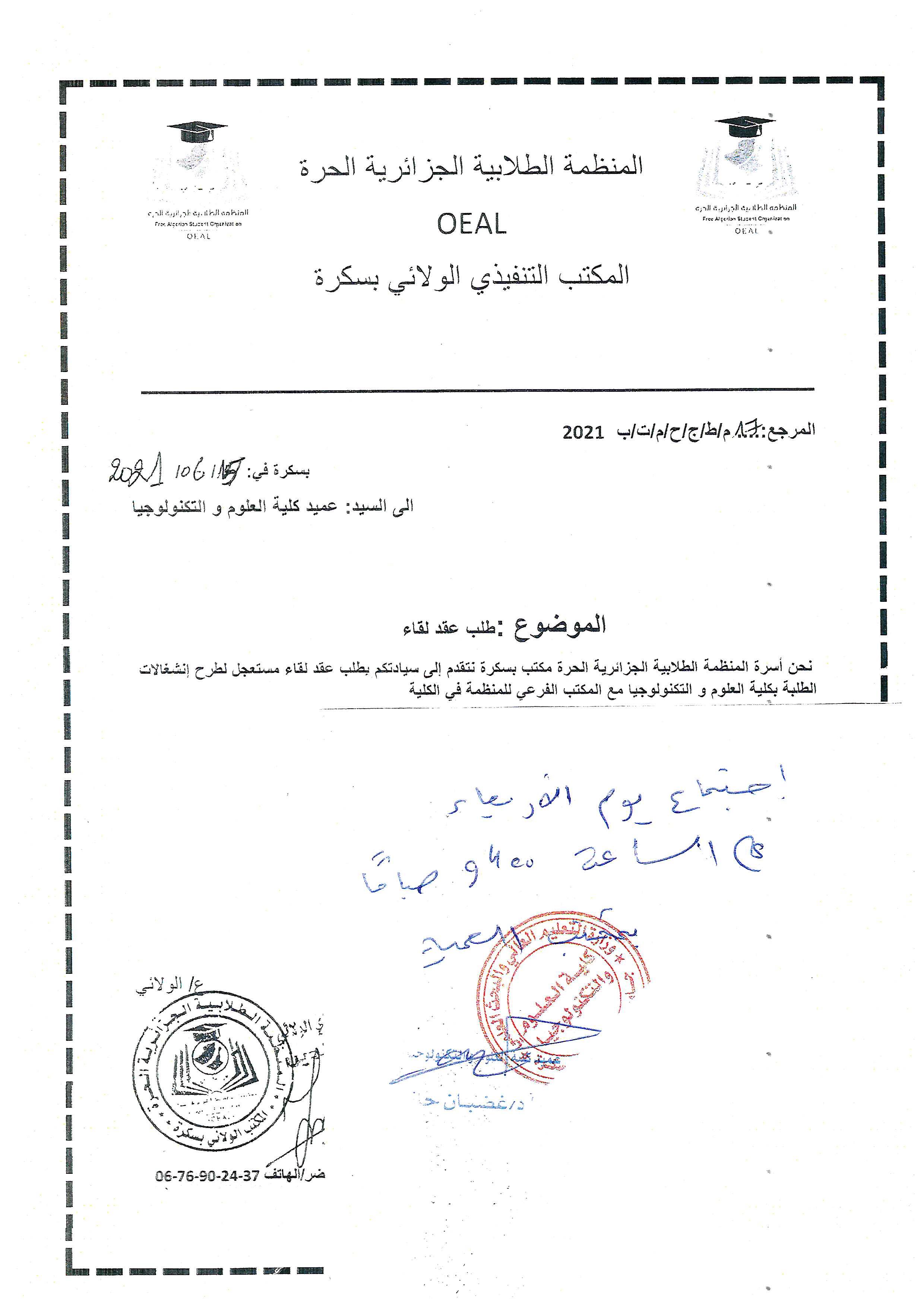 يعلم عميد كلية العلوم و التكنولوجيا ممثلي التنظيم " المنظمة الطلابية الجزائرية الحرة"عن عقد إجتماع يوم الأربعاء 16 جوان 2021, على الساعة التاسعة (09:00) بقاعة الإجتماعات بالعمادة.