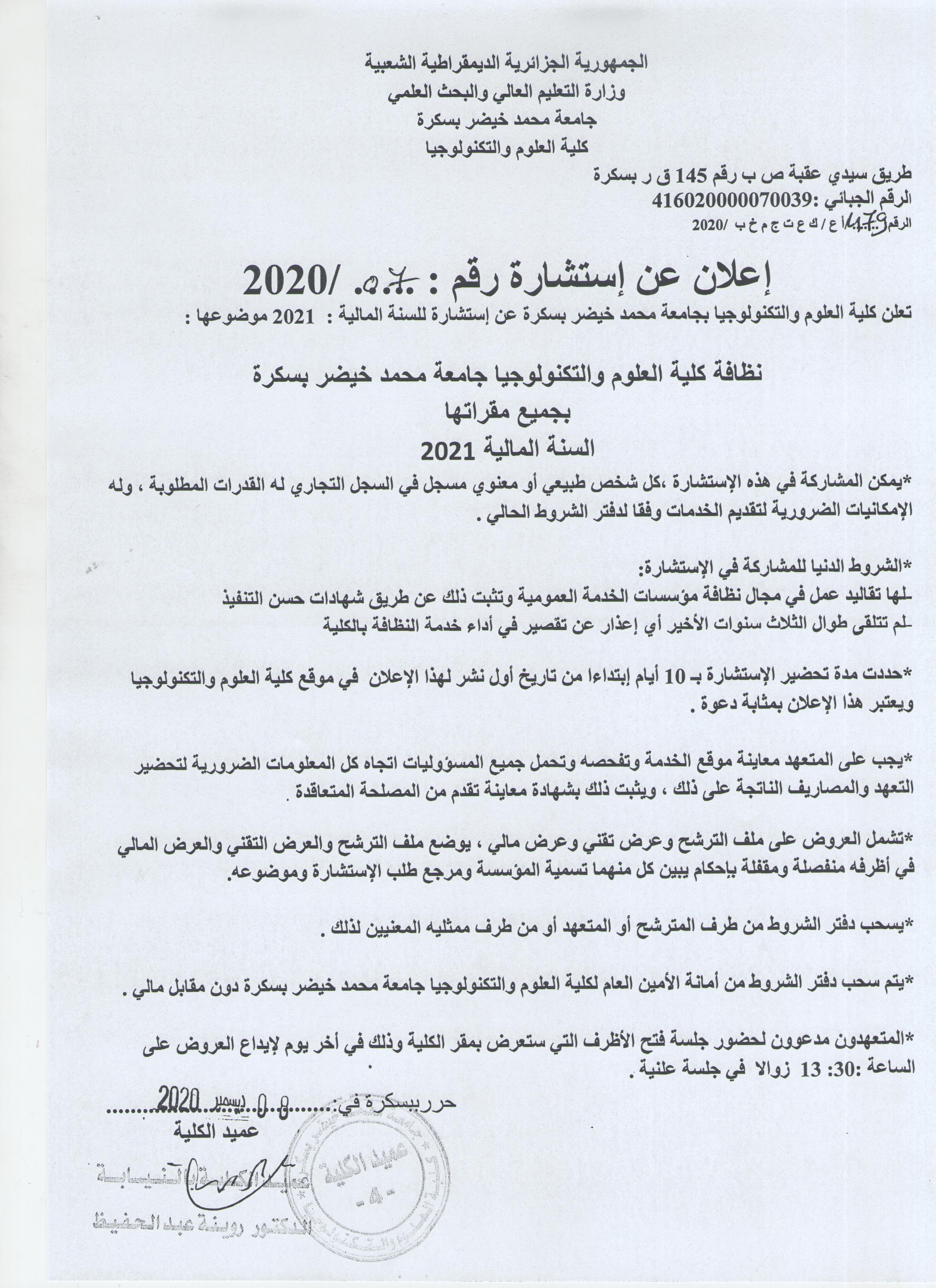 إعلان عن استشارة رقم 2020/07 خاصة بنظافة الكلية