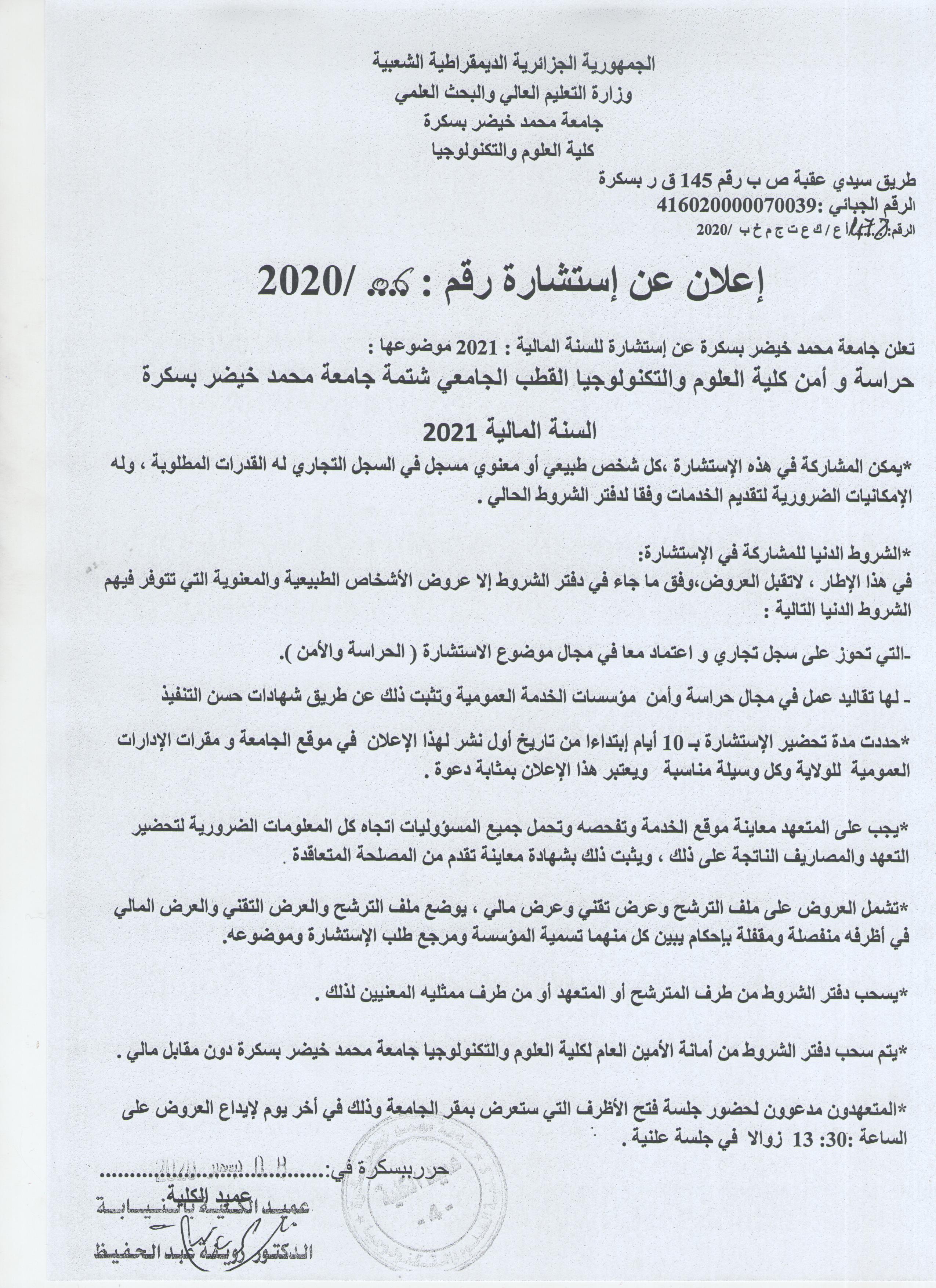 إعلان عن استشارة رقم 2020/06 خاصة بحراسة و أمن الكلية القطب الجامعي شتمة