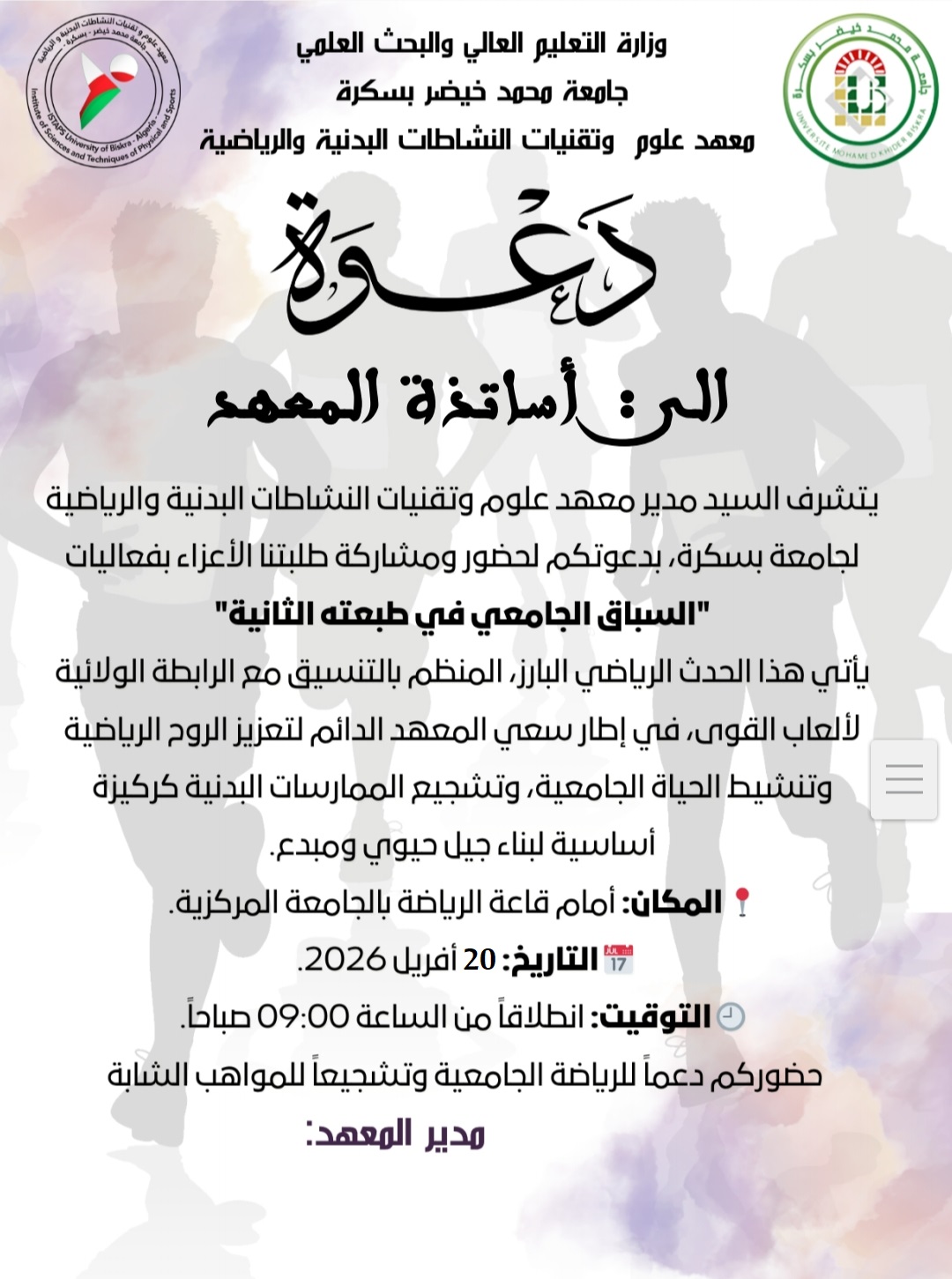 هذه دعوات خاصة بــــ السباق الجامعي الطبعة الثانية ونهائي كأس المعهد الطبعة الثانية - مرسلة الى الطلبة و الأساتذة و الموظفين: