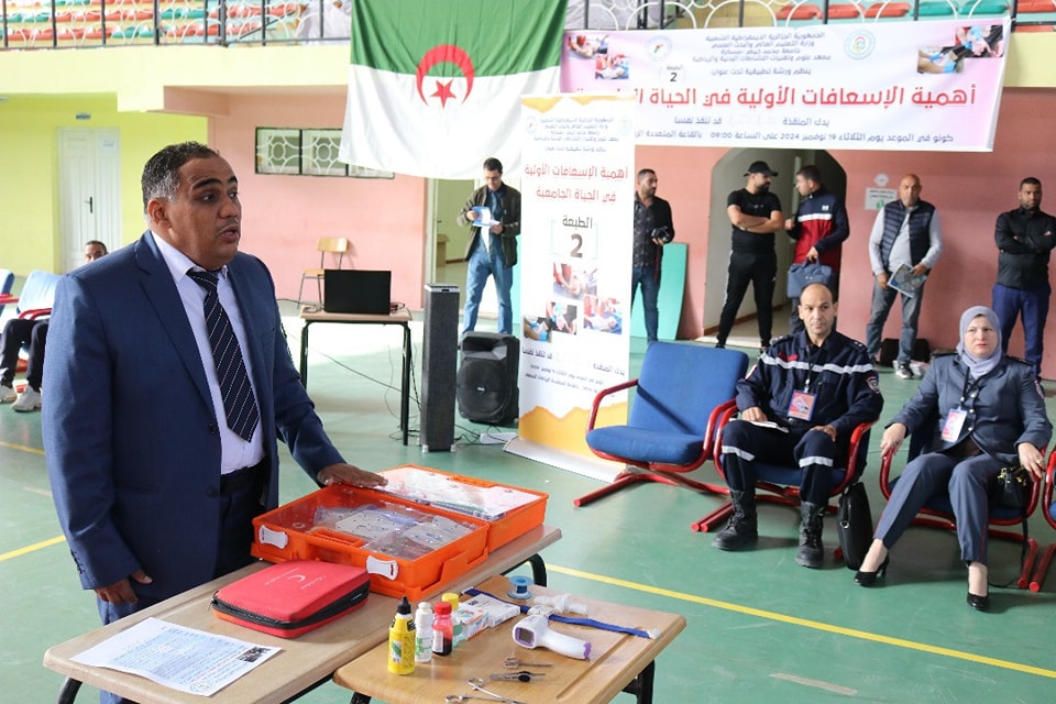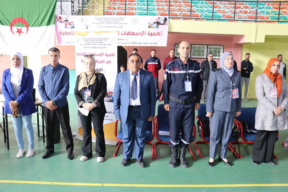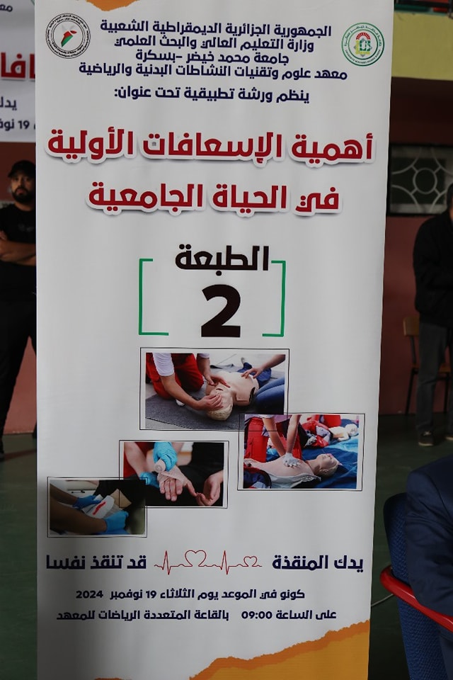 نظم معهد علوم وتقنيات النشاطات البدنية والرياضية بجامعة بسكرة، بالتعاون مع مديرية الحماية المدنية ومديرية الصحة لولاية بسكرة، يوماً دراسياً تحت شعار "يدك المنقذة... قد تحيي نفساً"، وذلك يوم الثلاثاء 19 نوفمبر 2024 بالقاعة المتعددة الرياضات.حضر التظاهرة العلمية مدير المعهد الأستاذ حميد دشري، إلى جانب ممثلي مديرية الحماية المدنية ومديرية الصحة، وعدد من الأساتذة والطلبة. ركزت فعاليات اليوم الدراسي على أهمية الإسعافات الأولية في حماية الطالب الجامعي، خاصة في مجال النشاط الرياضي. وشهدت التظاهرة مداخلات علمية وجلسات تطبيقية أشرف عليها مختصون، تخللتها ورشات تدريبية حول التدخلات السليمة للإصابات الأكثر شيوعاً.