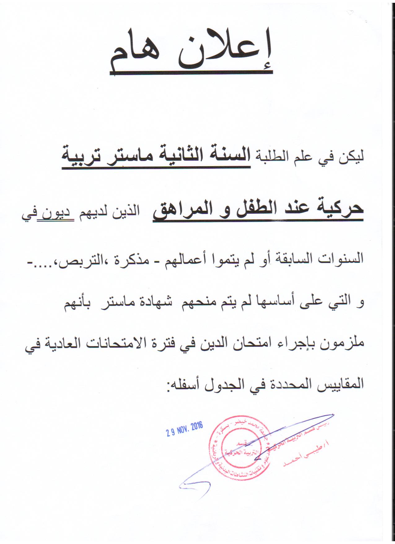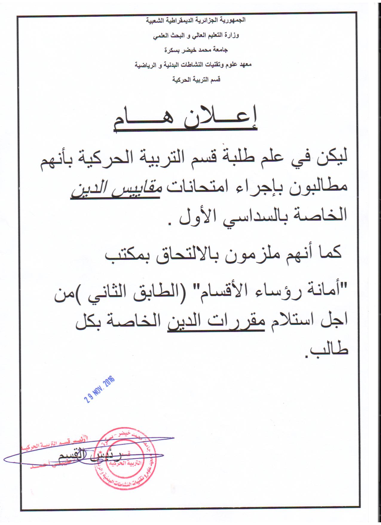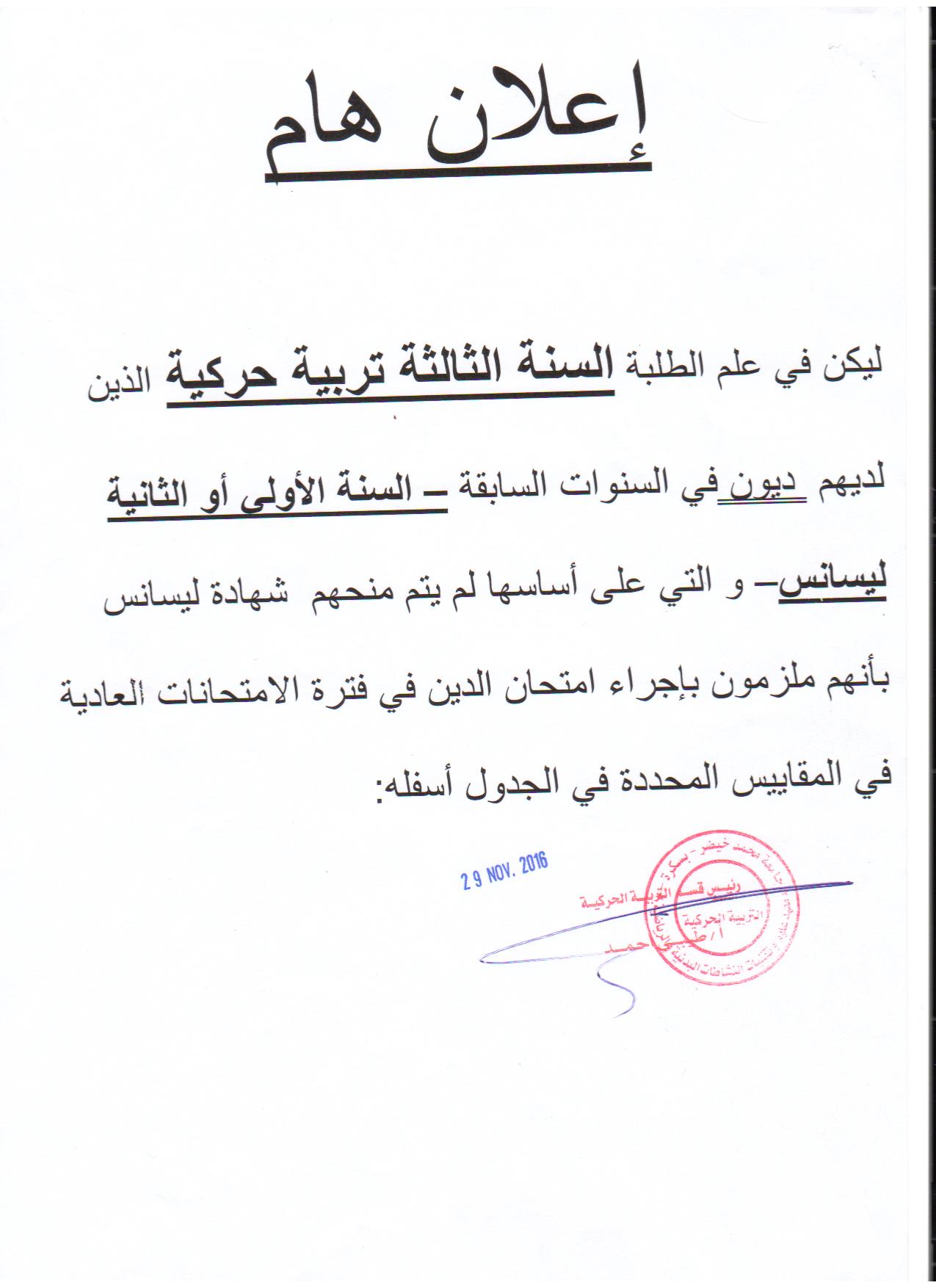يعلن رئيس قسم التربية الحركية الى جميع طلبة القسم ما يلي :