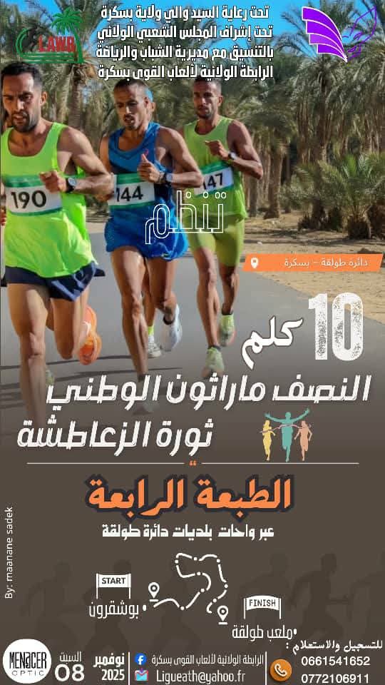تم تنظيم يوم السبت 08 نوفمبر 2025 نصف مراطون الزعاطشة الطبعة الرابعة ( على طول مسافة 10 كلم) عبر واحات بلديات دائرة طولقة و قد شارك مجموعة من طلبة المعهد في هذه التظاهرة الرياضية.
