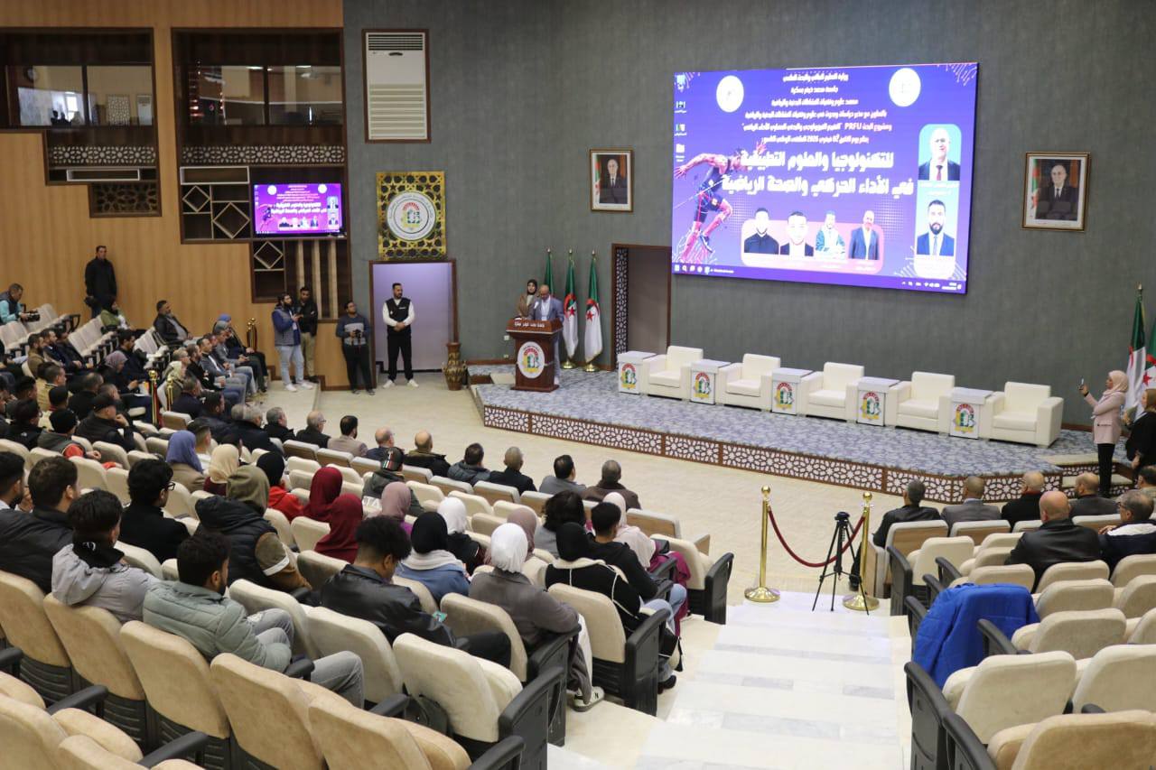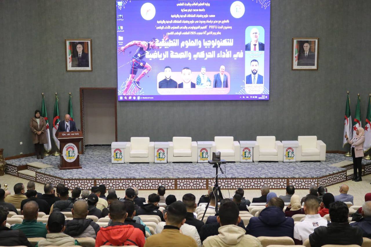 نظمه معهد علوم وتقنيات النشاطات البدنية والرياضية بجامعة محمد خيضر بسكرة، صبيحة يوم الاثنين 02 فيفري 2026، اشغال الطبعة التاسعة للملتقى الوطني الموسوم بـ "التكنولوجيا والعلوم التطبيقية في الاداء الحركي والصحة الرياضية"، بقاعة المحاضرات الكبرى عمر عساسي ، بحضور اطارات ومسؤولي الاسرة الجامعية، يتقدمهم مدير الجامعة الاستاذ زهير ديبي، الى جانب نواب المدير، عمداء الكليات، اساتذة وطلبة الجامعة. #واستهلت مراسم الافتتاح بكلمة رئيس الملتقى الاستاذ مرابط جمالي، الذي قدم عرضا موجزا حول محاور الملتقى وورشاته العلمية، مبرزا اهمية المداخلات العلمية المنتقاة بعد التحكيم، وما تحمله من اضافات بحثية تواكب تطورات المجال.